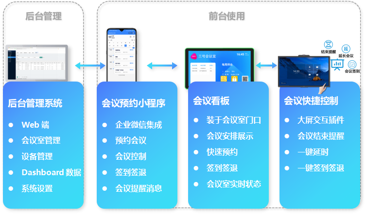 Smart Meeting 智能會議室預約系統通過軟件與硬件的部署整合,簡化了各企業會議室資源的管理,打造更加智能和便利的辦公環境,從而幫助用戶合理高效利用會議室資源,降低辦公成本、實現人力資源效率化。