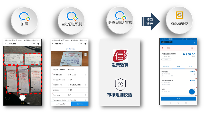 隨著金稅四期的正式啟動以及財政部、國家檔案局《關于規范電子會計憑證報銷入賬歸檔的通知》的發布,發票等財務票據的電子歸檔和保存管理已成為企業必不可少的流程。富士施樂智能費控解決方案采用人工智能技術,可在不改變企業原有IT系統、財務流程/制度、費控制度的前提下,實現隨時隨地差旅和日常報銷的全流程自動化。如員工報銷差旅費時只需簡單幾步:1)打開微信小程序智能報銷助手創建費用報告;2)通過手機拍照、選擇相冊圖片、微信卡包、手動輸入、多張票據組合或導入電子發票上傳、提交需報銷票據;3)系統自動切割/識別票據有效信息:4)發票驗真:5)根據食宿、火車座位/飛機倉位等級等企業差旅規定以及預算等規則自動審核/校驗并篩出錯誤或不合格信息,如:電子發票簽章是否被修改、發票號與金稅底賬庫信息是否一致等;6)確認票據信息無誤后提交;7)財務審批、付款。