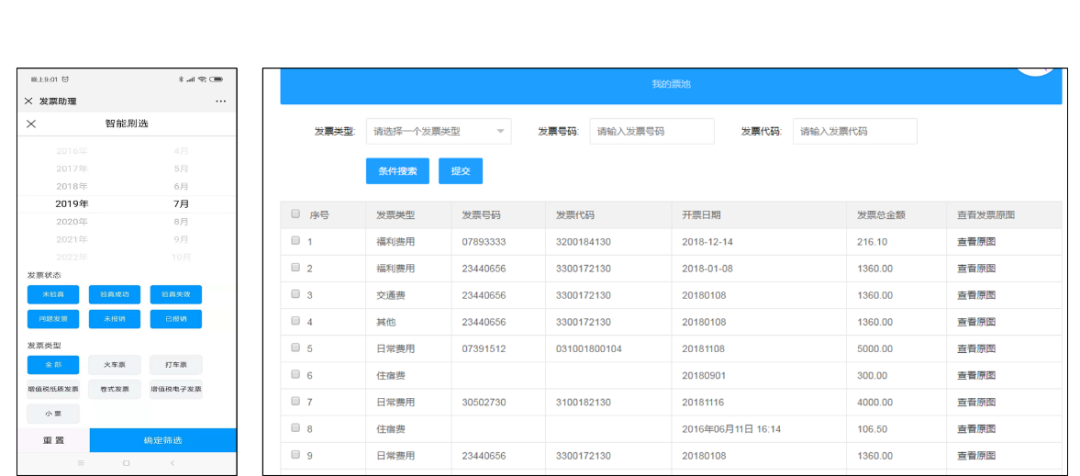 此外,所有上傳系統的票據還可自動歸檔并按不同需求生成各類可視化報表,如:可檢索、篩選票據狀態、類型、時間等的臺賬查詢統計表;可按類別篩選、導出抵稅數據報表,如包含火車票(含員工姓名)、飛機行程單、高速路票等交通類票據的抵稅數據報表……